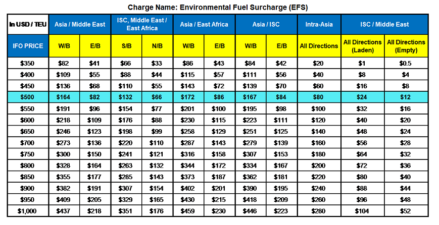 2020年1月1日より、IMO(国際海事機関)によるSOXS排出規制が施行されます。この規制により燃料油の硫黄分許容限度は、3.5%から0.5%に引き下げられます。EMIRATES SHIPPING LINEに於きましては新基準を完全に履行することにより環境問題に取り組むため今後LOW SULPHUR FUELの使用を決定いたしました。それに伴いENVIRONMENTAL FUEL SURCHARGE と致しまして、トレード毎、燃料価格帯、トレード係数を基に下記の通り算出いたしました。ご理解とご協力をお願い申し上げます。